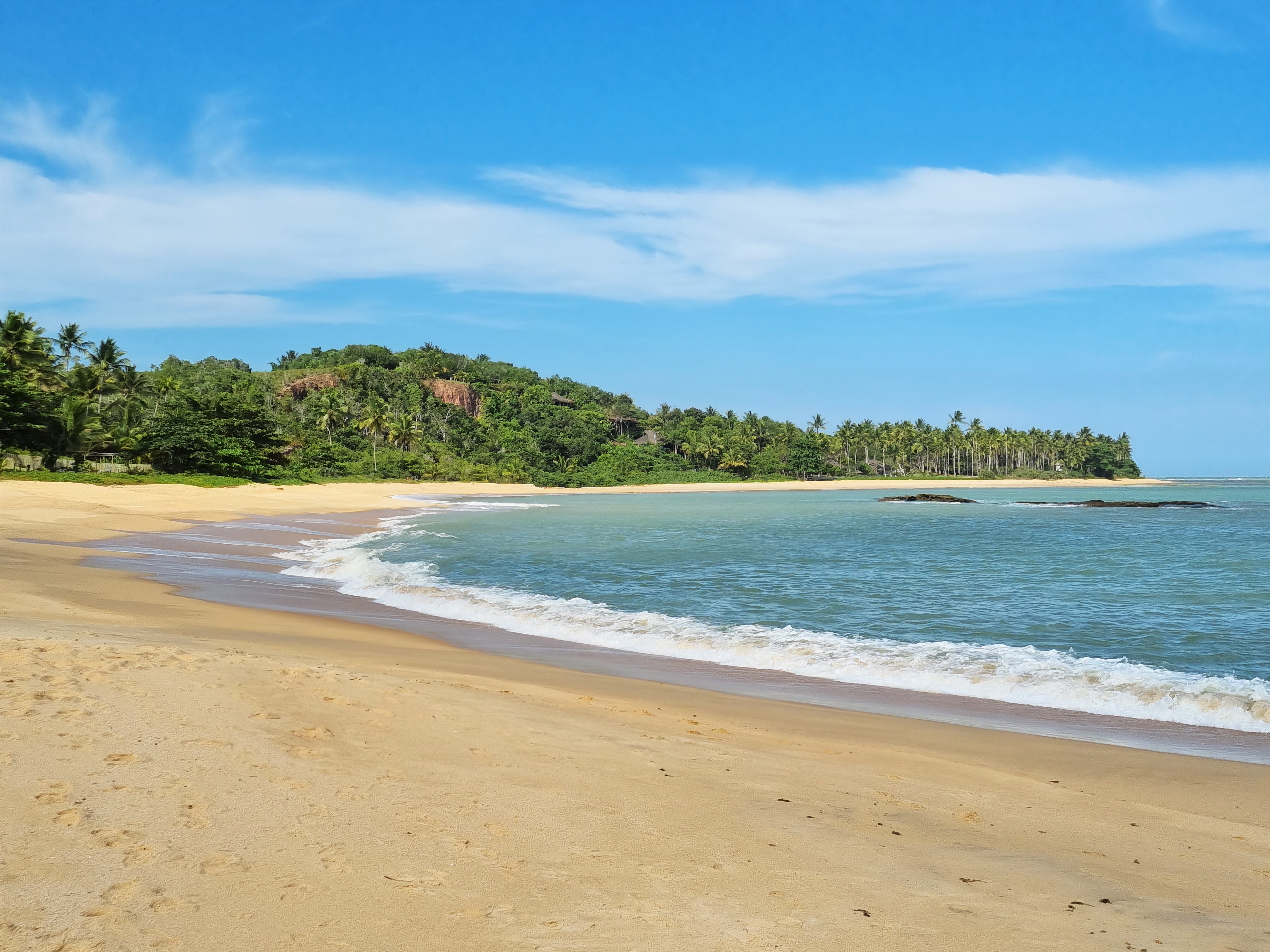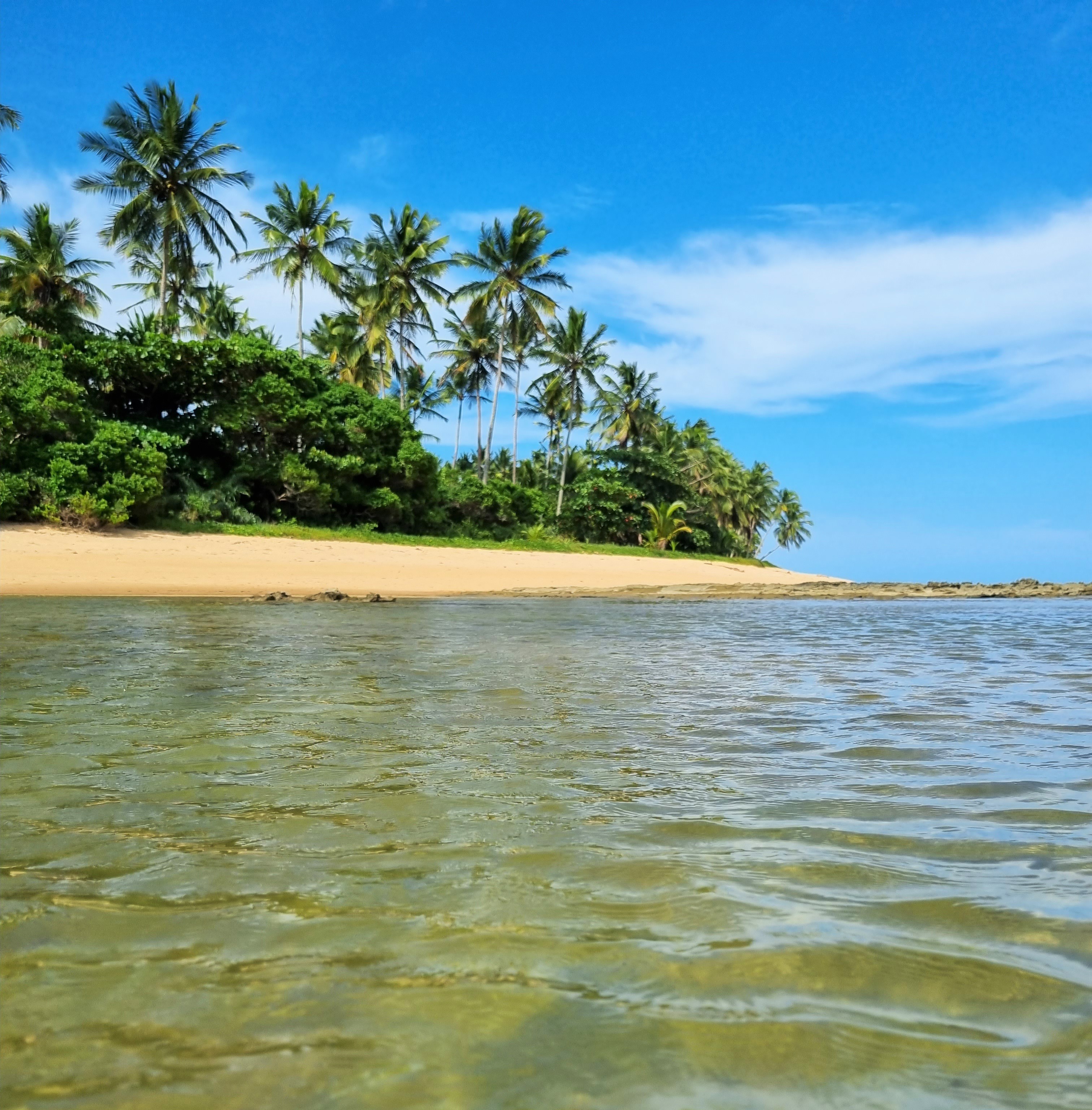 Então levantamos acampamento e fomos para a Praia do Espelho, de taxi. Ficamos sabendo lá que esta praia é conhecida como “as férias das férias”. Dá pra entender. Pousadas pé na areia, comida boa, drinks delícia e você sentado sob as árvores, observando os tons de verde e azul de um mar indescritível. E olha que não pegamos a maré baixa, que é o que dá a fama ao lugar. Nas primeiras horas naquele lugar fizemos o que a alma mandava: passamos horas olhando o mar, tomando um drink de boas vindas (e outros que se seguiram, claro). A foto abaixo é da paisagem que estava exatamente à nossa frente.