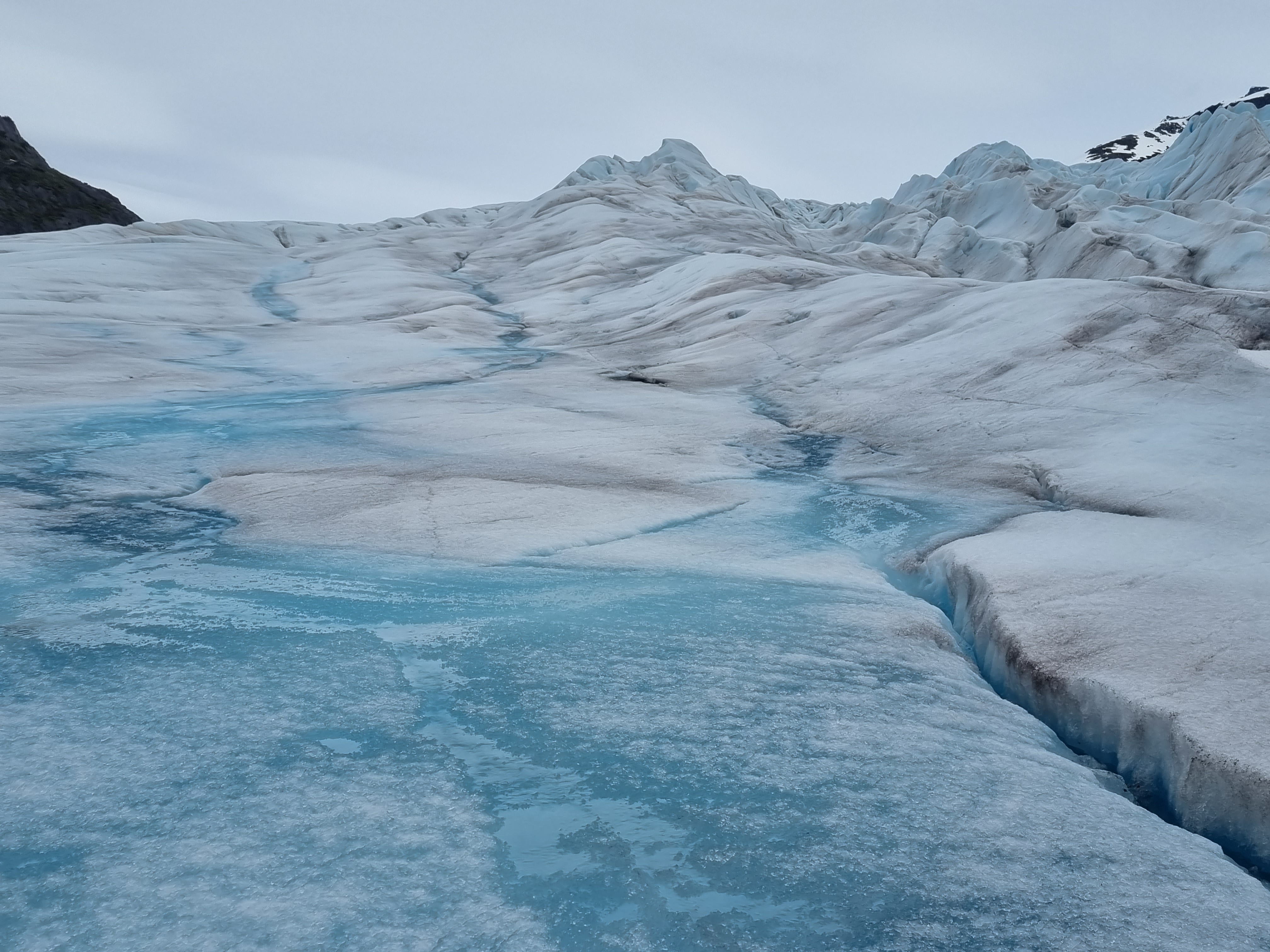 No terceiro dia fizemos um passeio de canoa no lago do Mendenhall Glacier, com parada para caminhar na lateral da geleira, enquanto os guias explicavam sobre a retração desta geleira. Não são todas as geleiras do Alasca que estão em retração, mas o cenário de todas as que visitamos é de um processo que vem se acelerando nas últimas décadas. Aqui, como não tenho conhecimento técnico, é importante dizer que apenas estou repassando o panorama retratado pelos guias que nos acompanharam.
