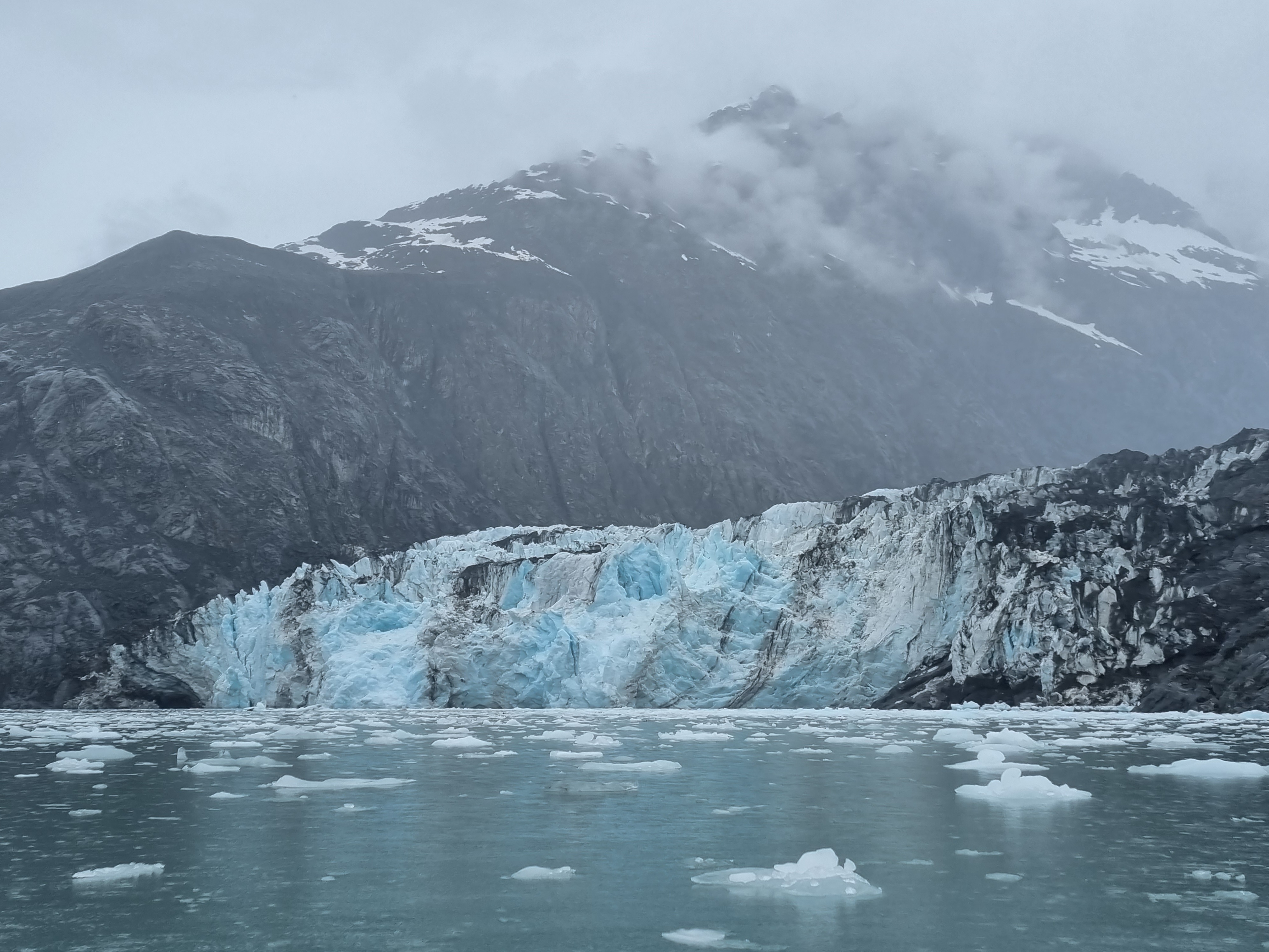 O passeio de caiaque na frente do Columbia Glacier foi a “loucurinha” da viagem. Sabíamos que seria desafiante, ainda que estivesse sol. Acontece que estava frio e chovendo. Nem posso dizer que foi azar, porque nas fotos que eu tinha visto do passeio não tinha nada parecido com “um lindo dia de sol”. Aqui, além das roupas normais de inverno, recebemos roupas de lona e partimos para a grande aventura. Na ida, vimos as baleias mais próximas de nós de toda a viagem. Lindo. Quanto ao caiaque na frente da geleira, nos desviando dos icebergs, foi mágico, mas honestamente é mais fácil falar isso agora. Na hora passou o pensamento de “por que uma pessoa em sã consciência acha que esta é uma boa maneira de passar um dia de férias?”.