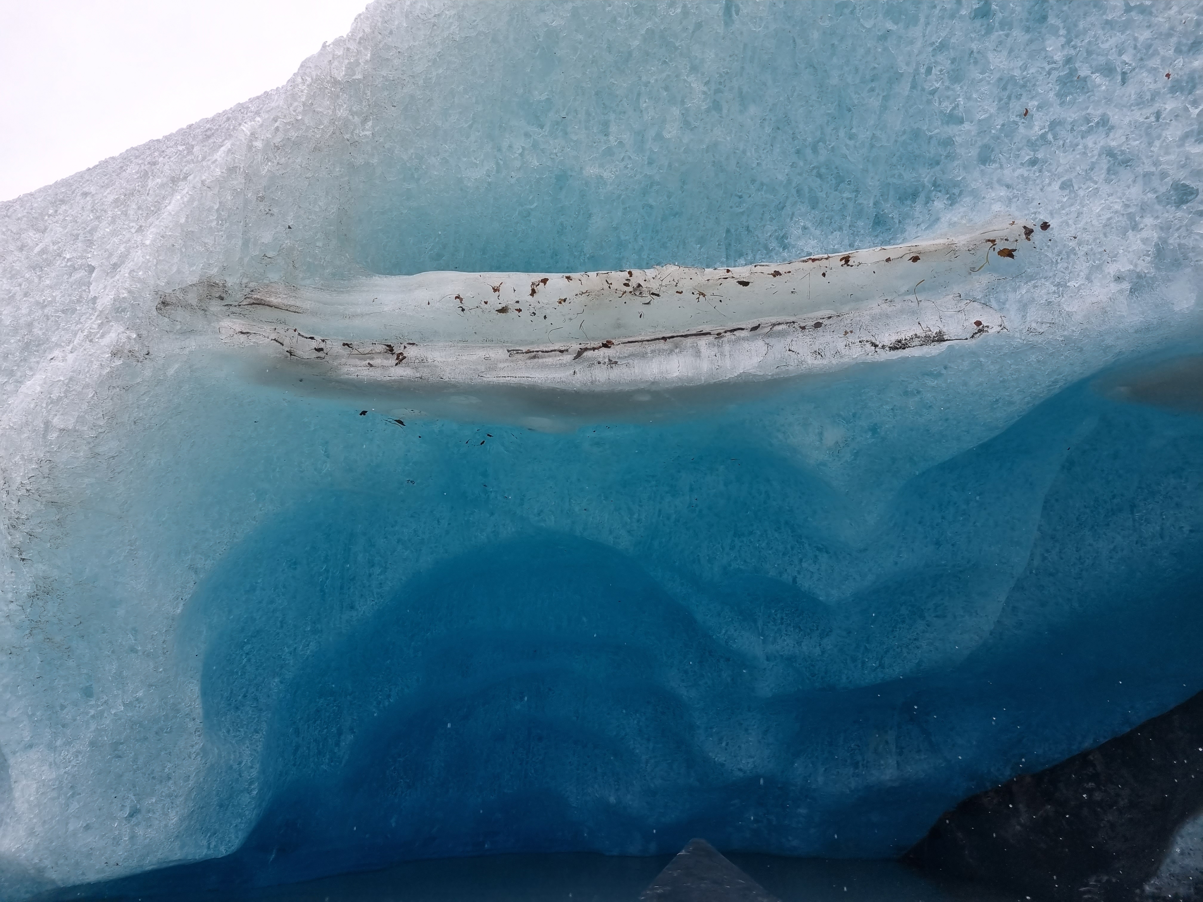 No dia seguinte, antes de nos despedirmos de Valdez, fizemos um passeio de canoa (desta vez o guia remou sozinho) pela lagoa do Glacier Valdez. Na verdade este foi o passeio que me fez decidir colocar a cidade no roteiro, porque tinha umas fotos de “ice caves” que tinham me deixado feliz, uma vez que, no verão, não é um achado simples. E realmente é um passeio lindo, com os maiores icebergs que vimos em todo o Alasca e que, por serem grandes, formam “ice caves” e, em algumas delas, foi possível entrar com o barco. Pronto, sonho realizado. Obrigada Valdez. Até descemos do barco para caminhar sobre um iceberg. No começo do passeio estava um tempo muito fechado e a visibilidade estava muito ruim, mas depois foi abrindo e curtimos um visual incrível. Adoramos o passeio.