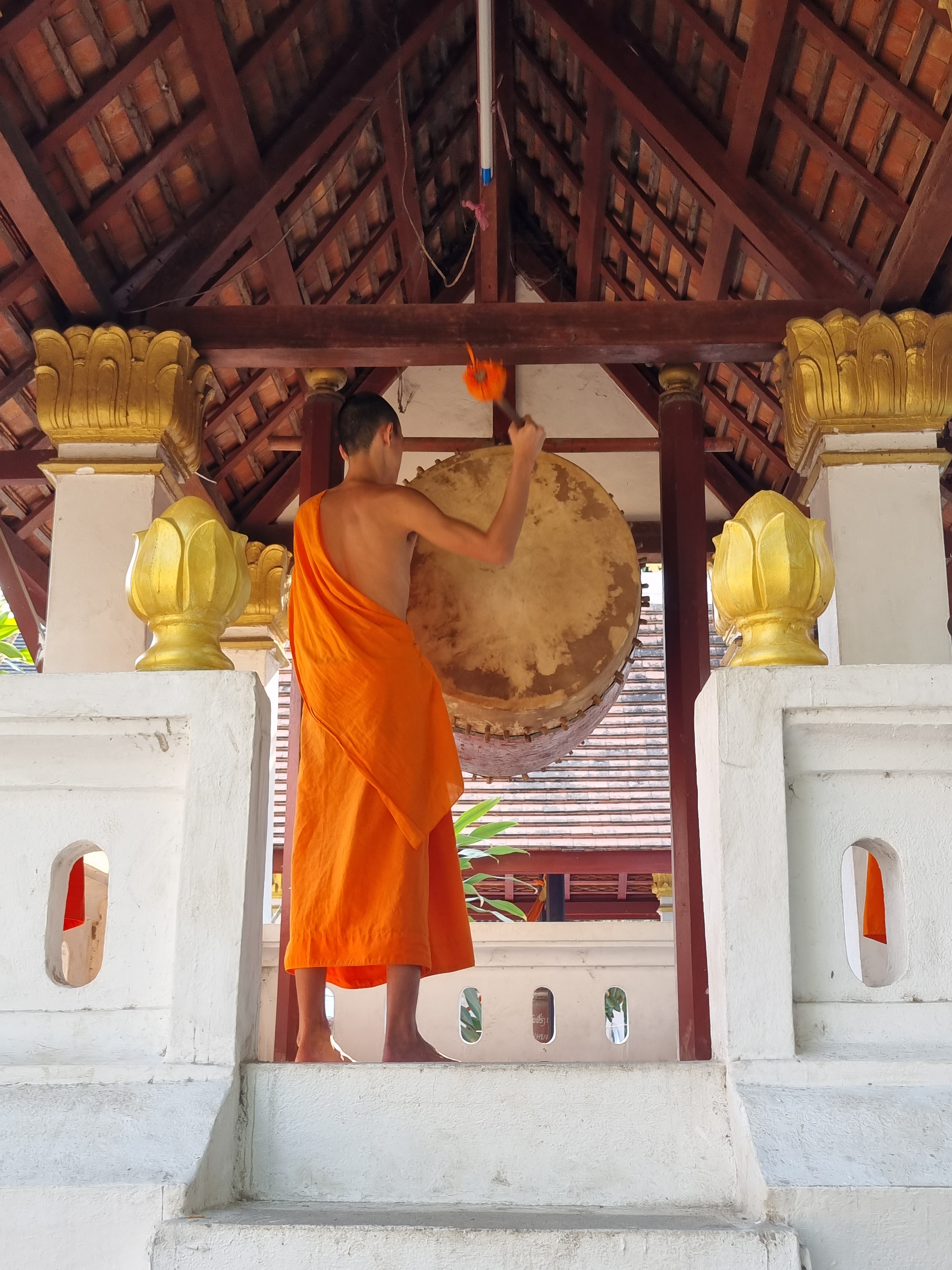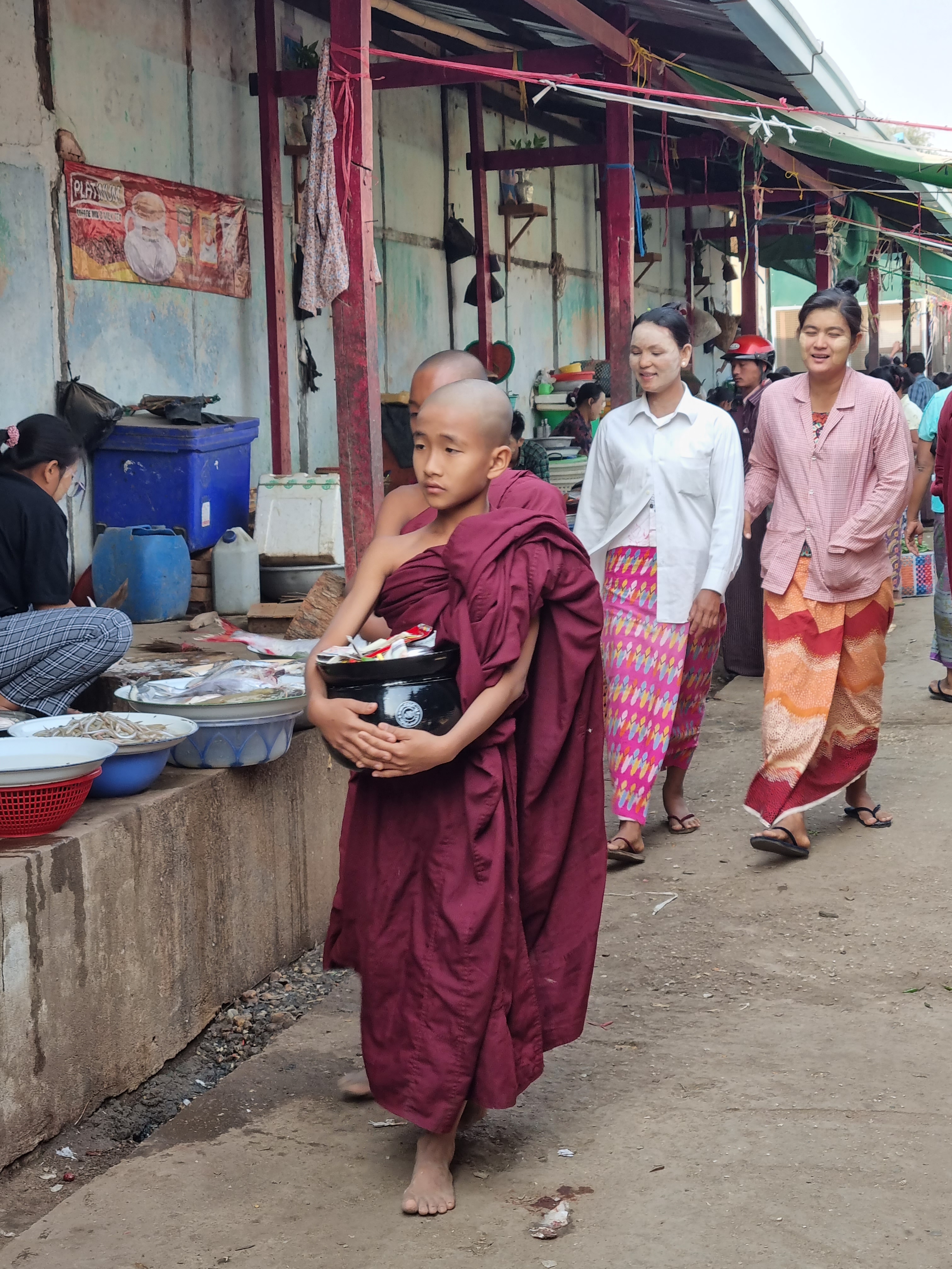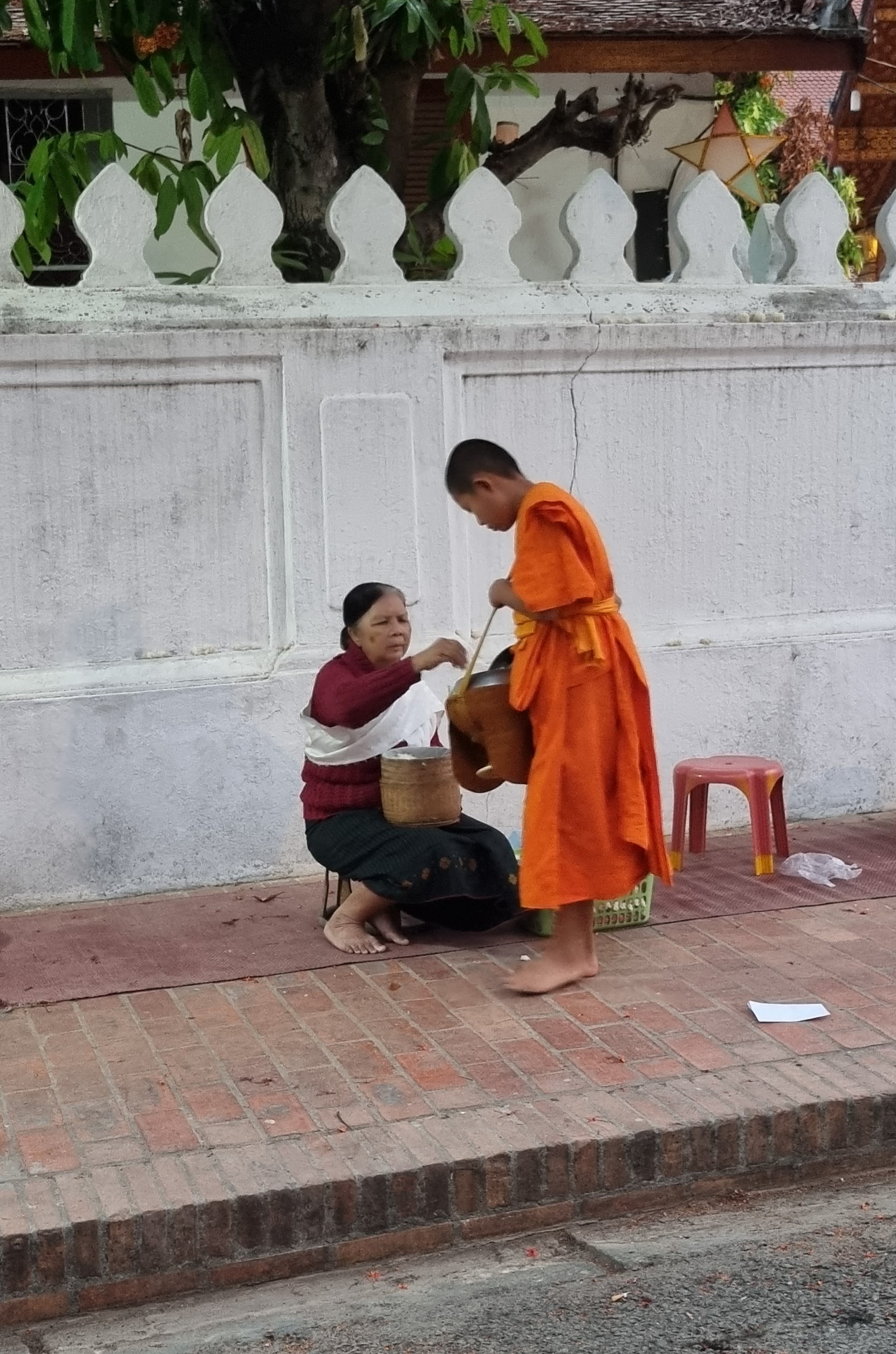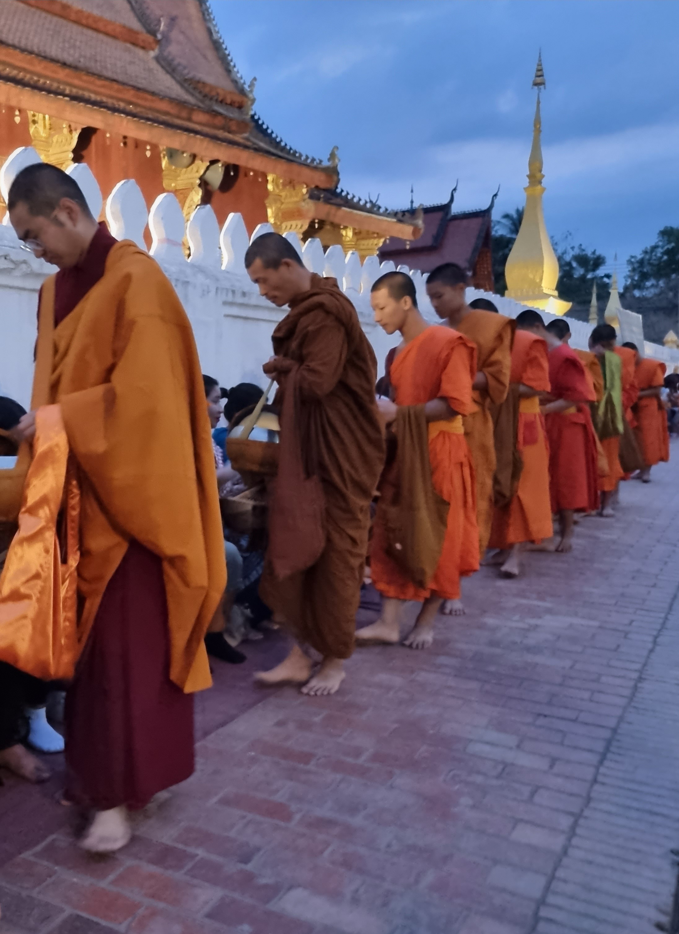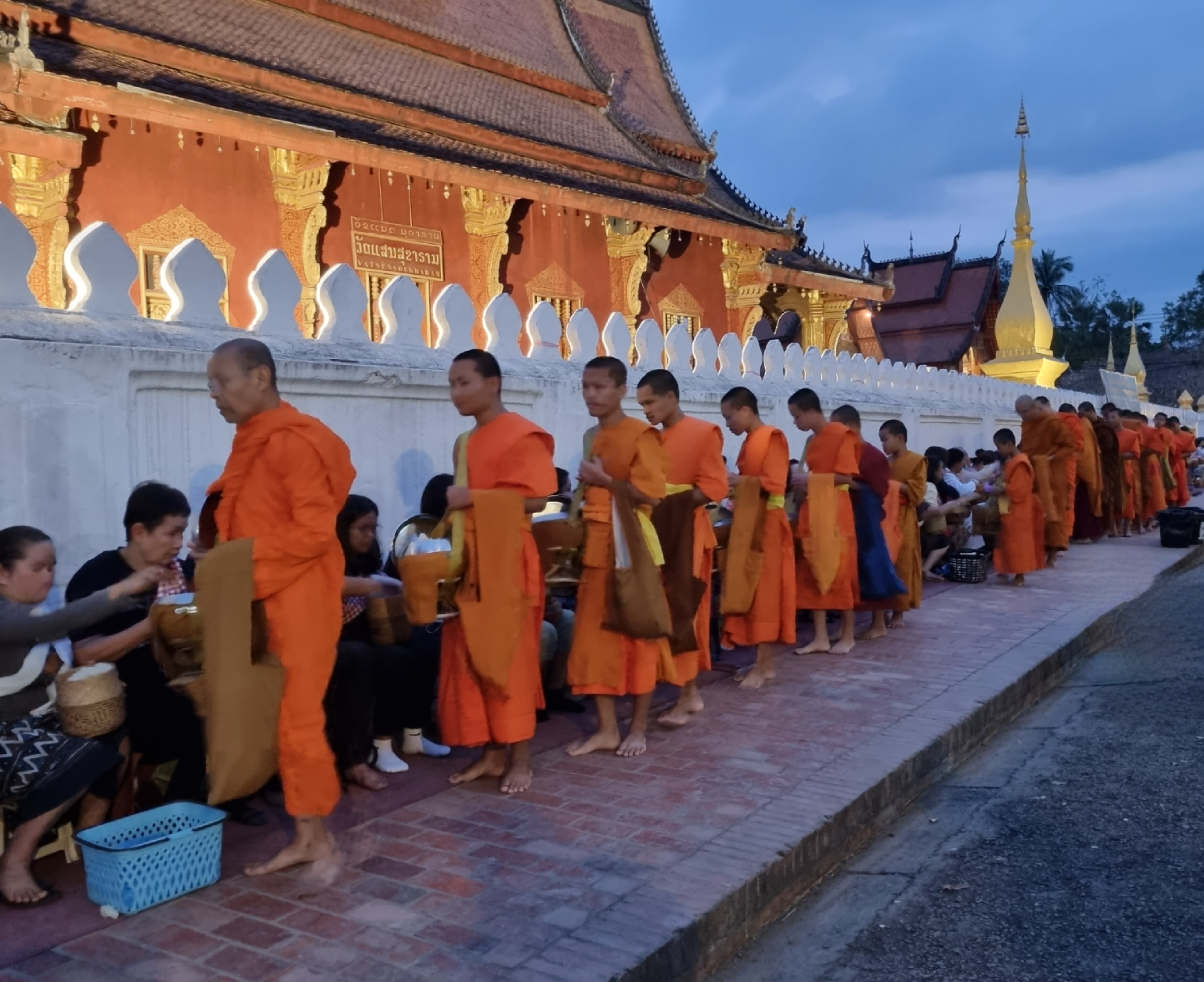 No segundo dia, bem cedo, fui conhecer um ritual que acontece diariamente entre os monges e a comunidade. A partir das 4 da manhã, os moradores (e turistas) se acomodam ao longo das calçadas, trazendo comida para oferecer aos monges (eles não compram comida, só comem o que recebem). Aos poucos, eles vão chegando e, em fila, vão passando pelos moradores e recebendo um punhado da comida ofertada. Tudo acontece em silêncio. Quando um morador está em necessidade, além da comida para ofertar, ele também leva um pote vazio. Ao passar por essas pessoas, os monges, além de receber um punhado de comida, também ofertam parte do que já coletaram, em uma troca muito bonita.