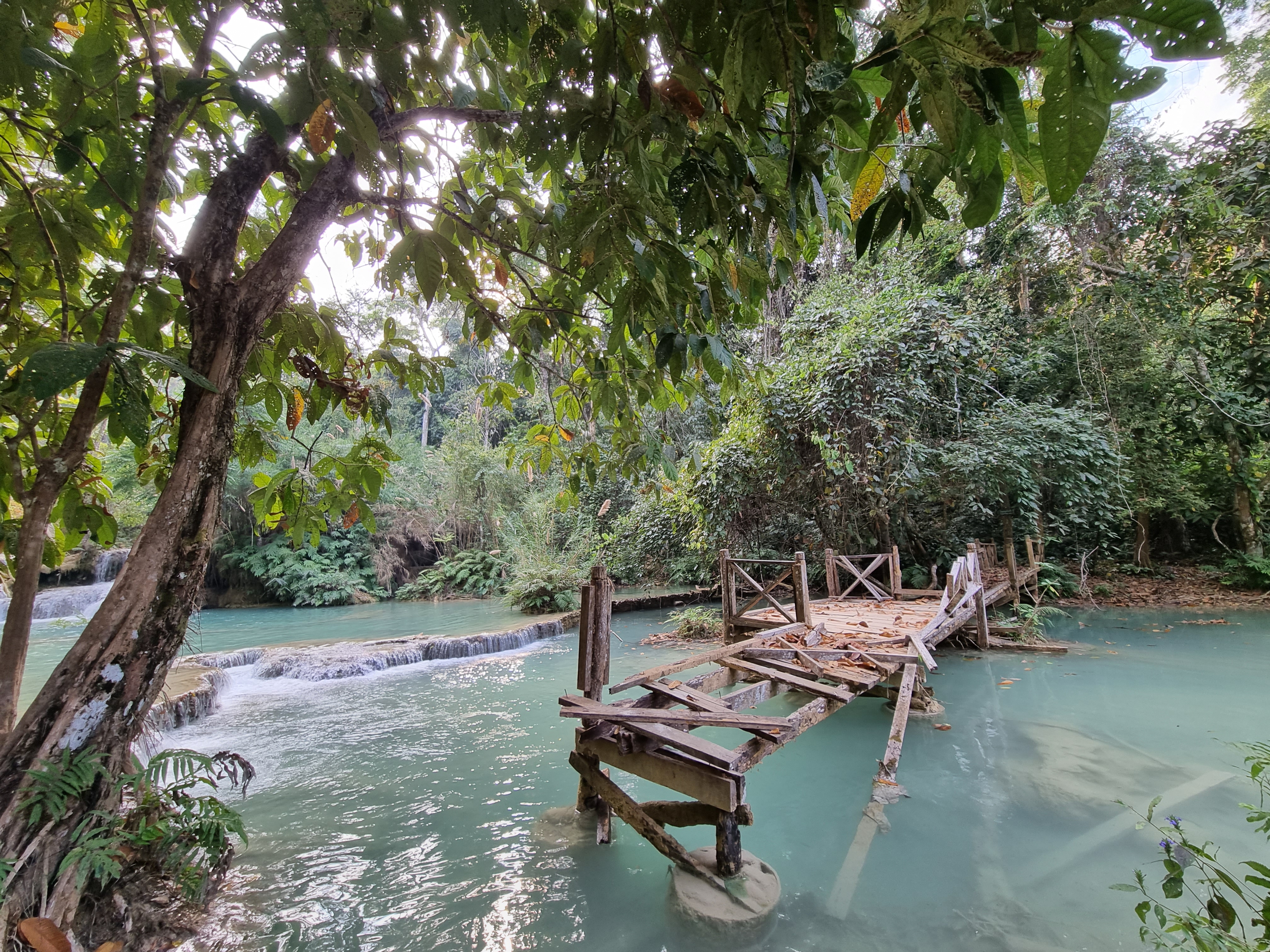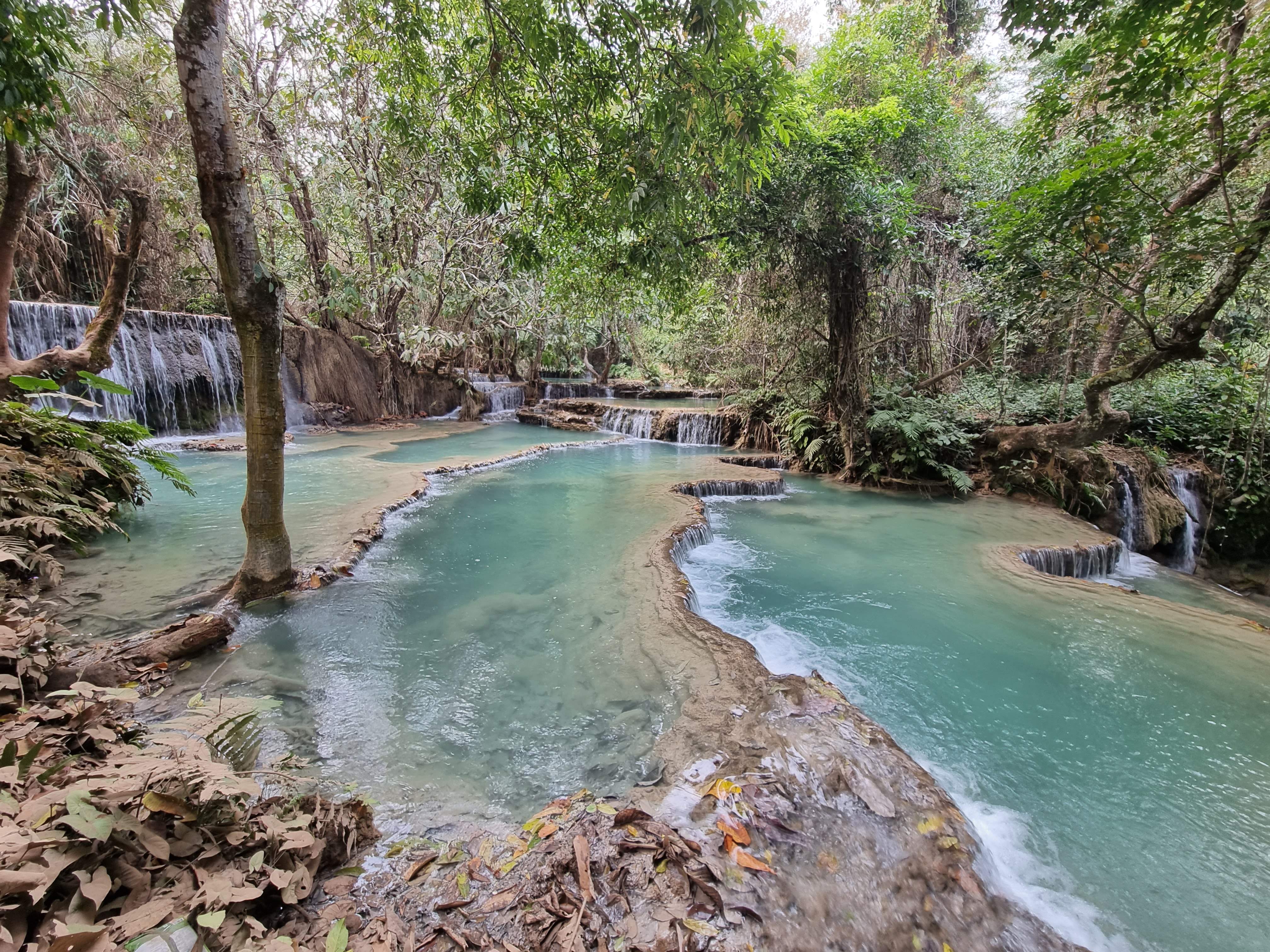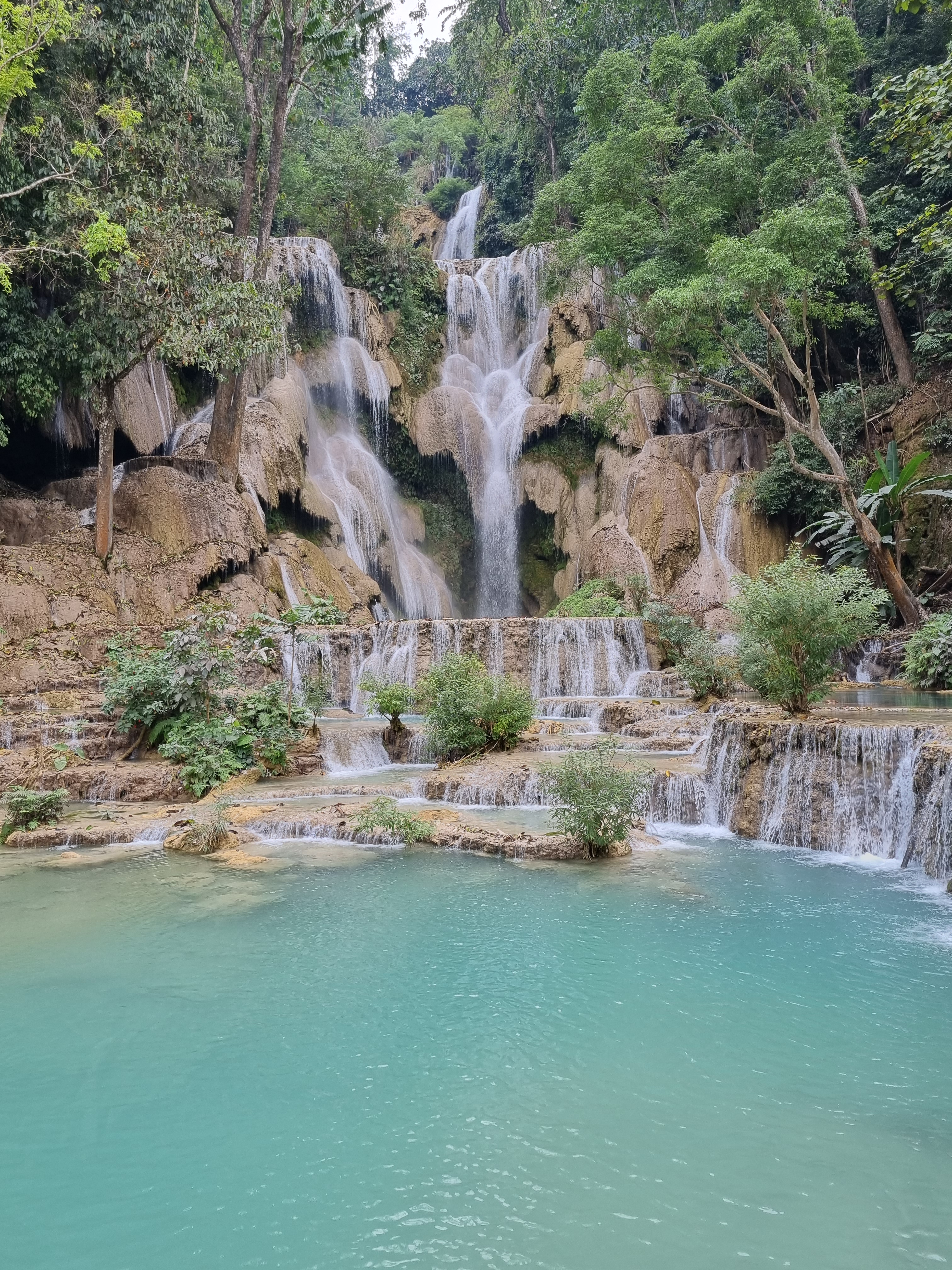 Na volta deste passeio, almoçamos e, depois, fomos até as cachoeiras de Kuang Si. Já tinha visto as fotos, sabia que eram bonitas, mas estar lá me surpreendeu muito. Água limpa, uma cor fascinante e você pode nadar tranquilamente.