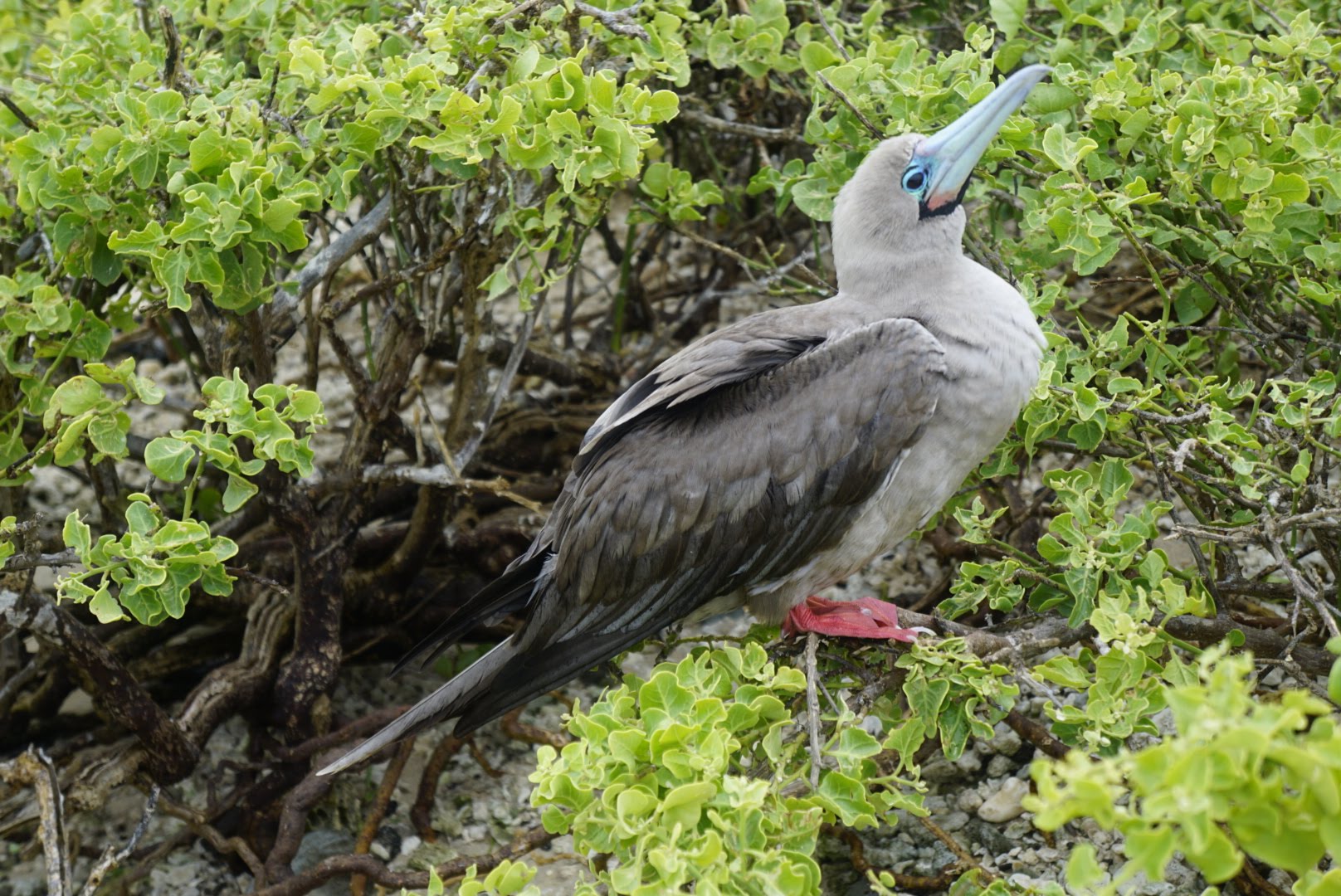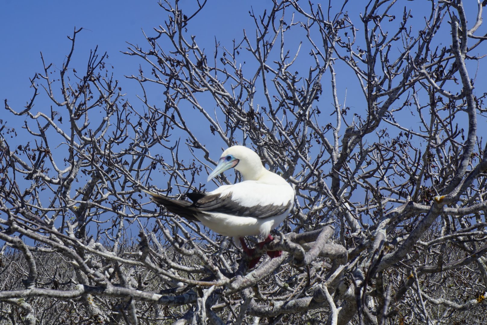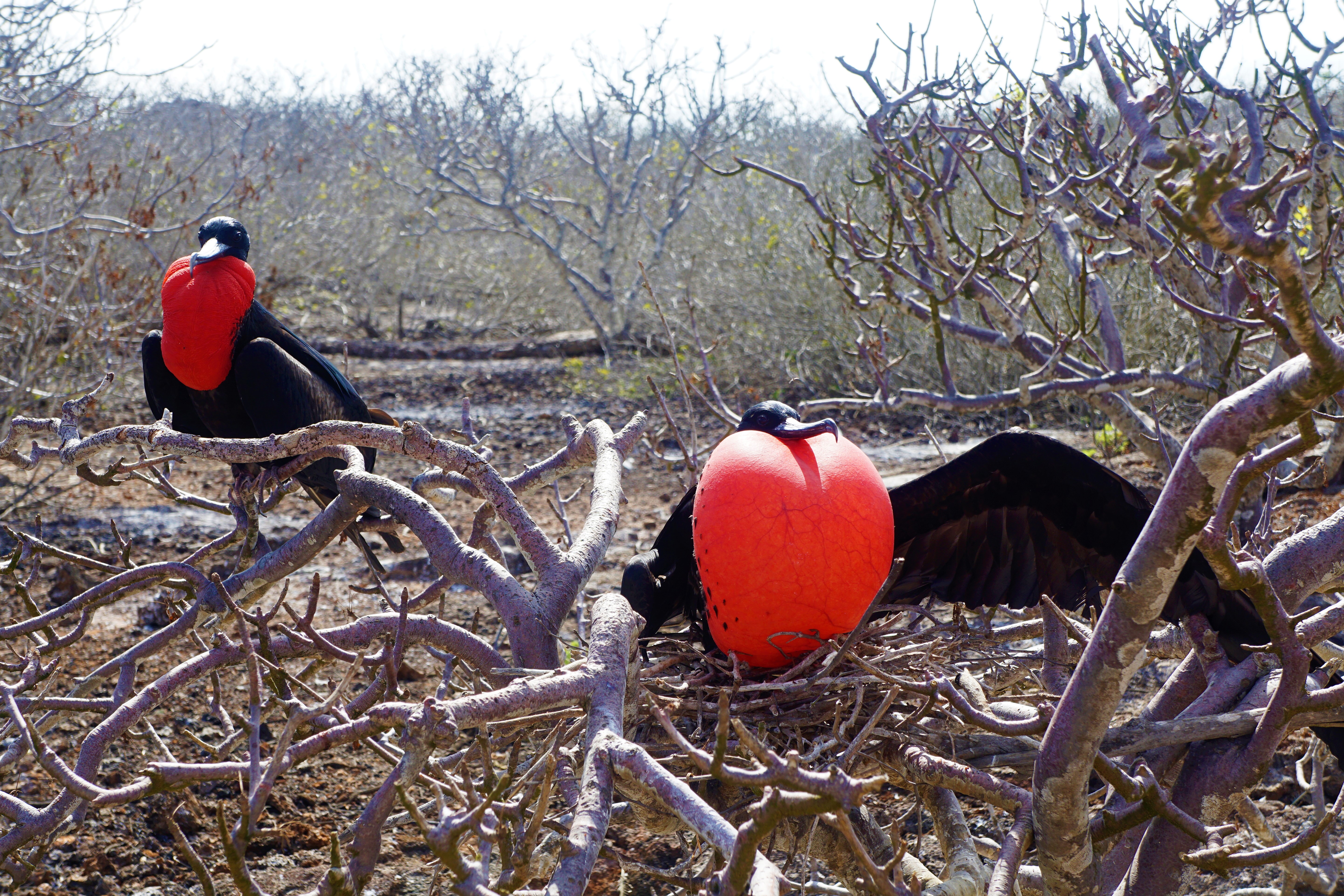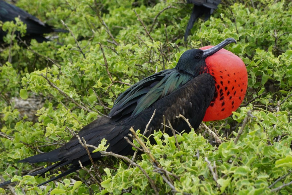 Em terra, vimos de muito perto dois pássaros que já tínhamos avistado ao longe em outras ilhas: o red-footed bobbie e a incrível fragata. Como estavam em época de acasalamento, as fragatas macho estavam dando show, abrindo as asas, cantando alto e inflando o papo para conquistar uma fêmea. Assistimos de camarote.