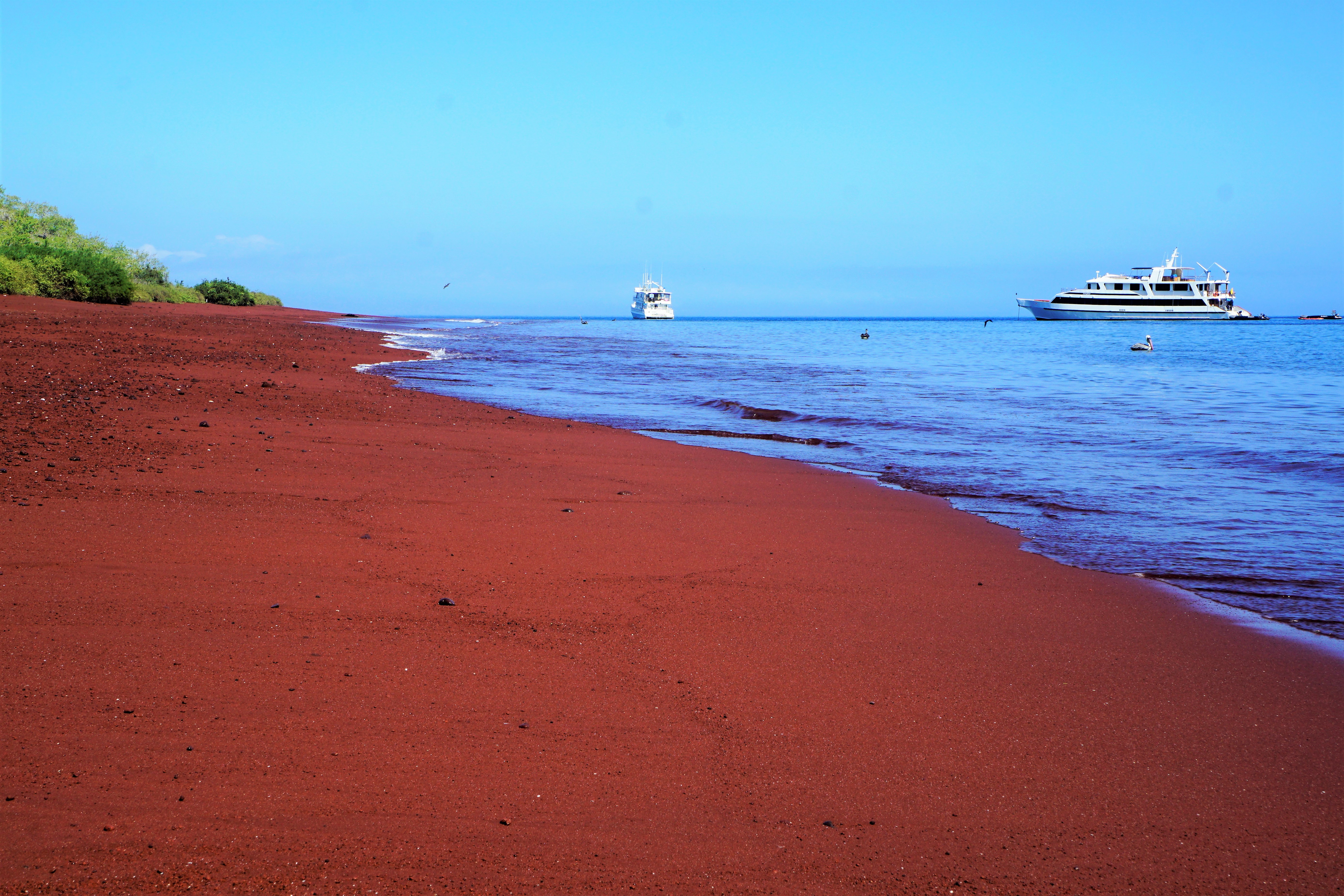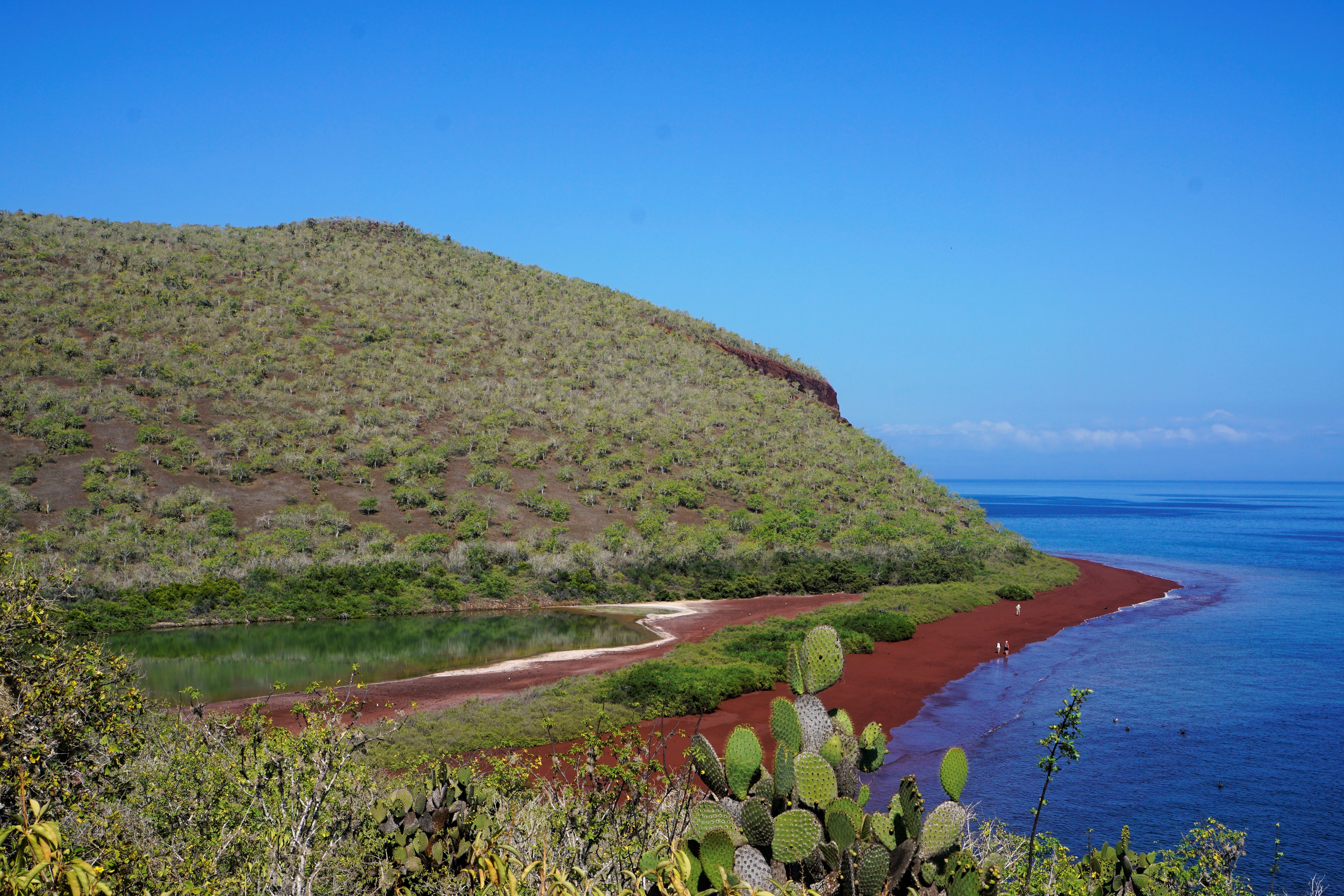 Não acabou. Ainda tem mais “uau” por aí. Rabida é uma praia de areia muito vermelha que, assim que descobri que existia, entendi que teria que estar incluída no meu roteiro por Galápagos. Como não é comum ela estar incluída nos itinerários, acabou sendo um fator decisivo para escolha do barco. Não me arrependi. Caçadora que sou de locais com natureza única, esta praia realmente me encantou. Fiquei paralisada na cena da areia vermelha, rodeada pelo verde da lagoa e da vegetação e pelo incrível azul do mar. Um encontro de cores inesperado e belíssimo.