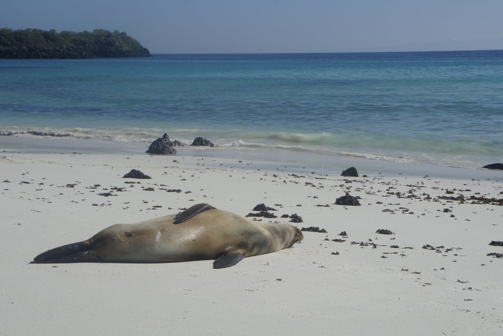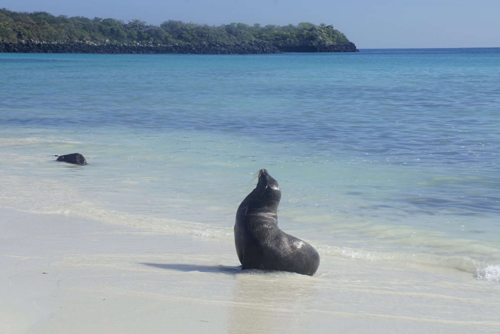 Este foi o dia de explorar a Isla Española. Começamos com uma caminhada na praia de Gardner Bay. A paisagem era: areia branca, mar turquesa e alguns leões marinhos e lagartos tomando sol. Praia lindíssima. Confesso que nem esperava. Como o meu foco nesta viagem era o encontro com os animais, as praias paradisíacas foram uma ótima surpresa!